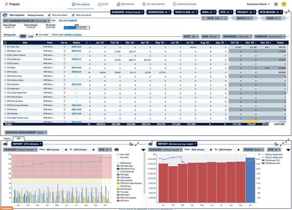 Forecast biomass, counts, harvest biomass, feed requirements, and logistics using machine-learned or customer-supplied tables. Build shared production plans driven by real operational data.